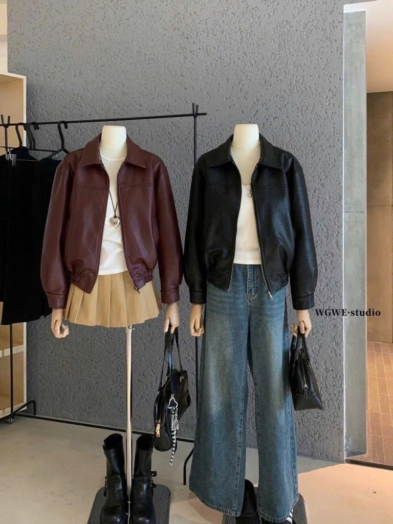 ❤️❤️❤️Áo khoác da PU WGWE cổ bẻ bo gấu -