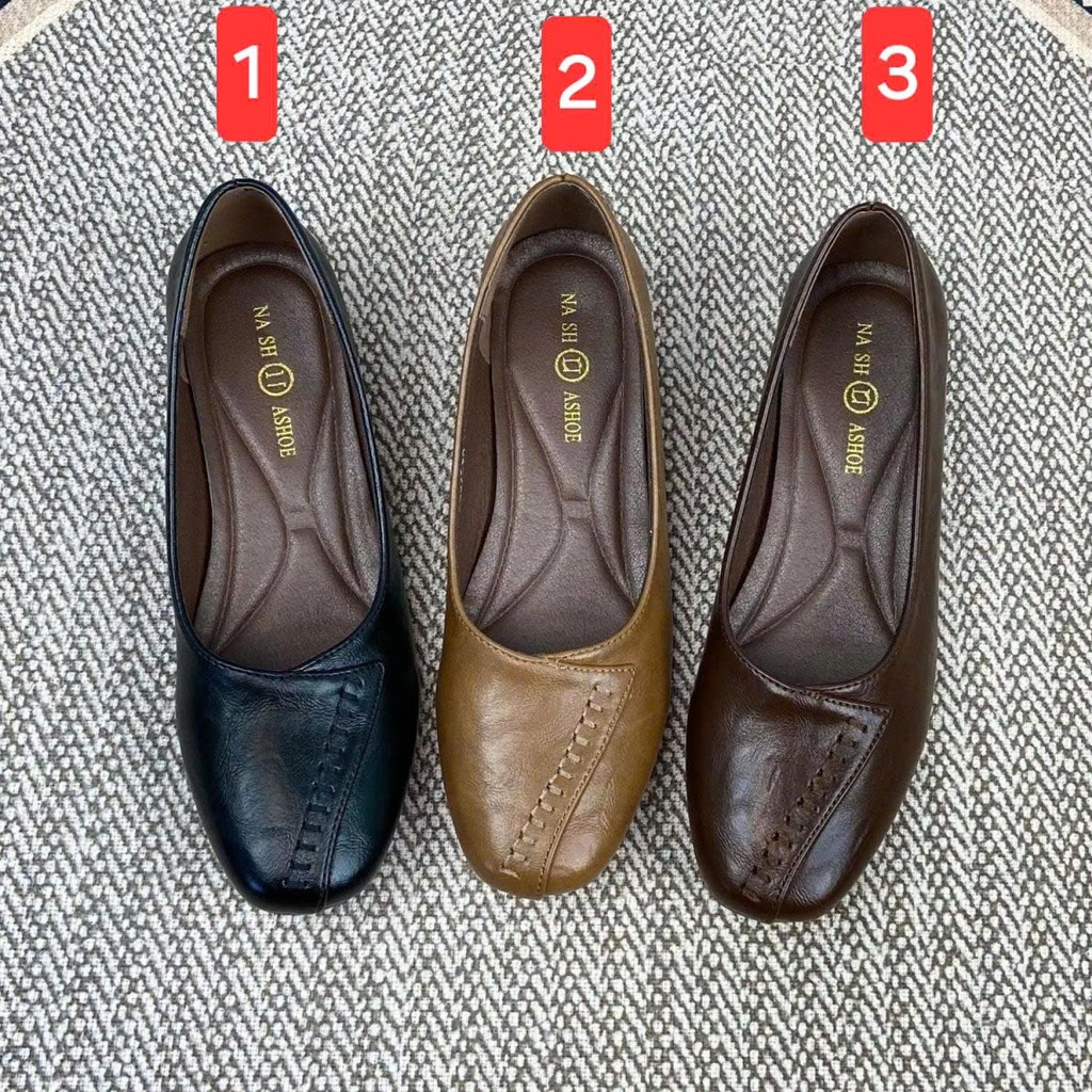 Mẫu giày bệt gót tròn phối mũi, thiết kế tối giản nhưng nổi bật, chất liệu mềm mại mang đến sự thoải mái tuyệt đối.