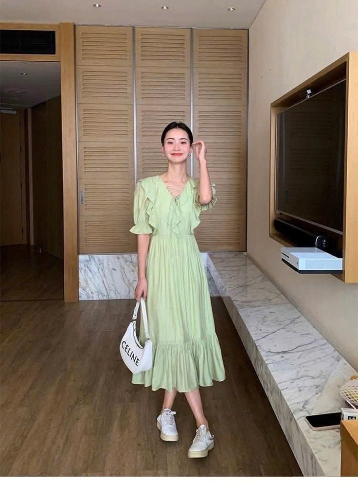 👉🏻 Váy dáng dài phối cổ chữ V, thiết kế ôm trọn vòng eo giúp tôn dáng, thanh lịch lắm ạ😍